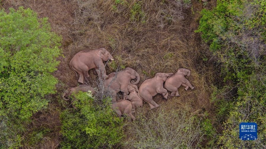 6月7日在云南昆明市晋宁区夕阳彝族乡拍摄的野象(无人机照片)。新华社发