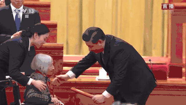 98岁高龄的夏森老人坐着轮椅上台领奖,她试图起身去接总书记颁授的荣誉证书。总书记轻轻拍拍她的肩膀,示意她坐下,暖心地弯腰俯身把证书递到老人手中。全场掌声雷动,众多网友热泪盈眶。