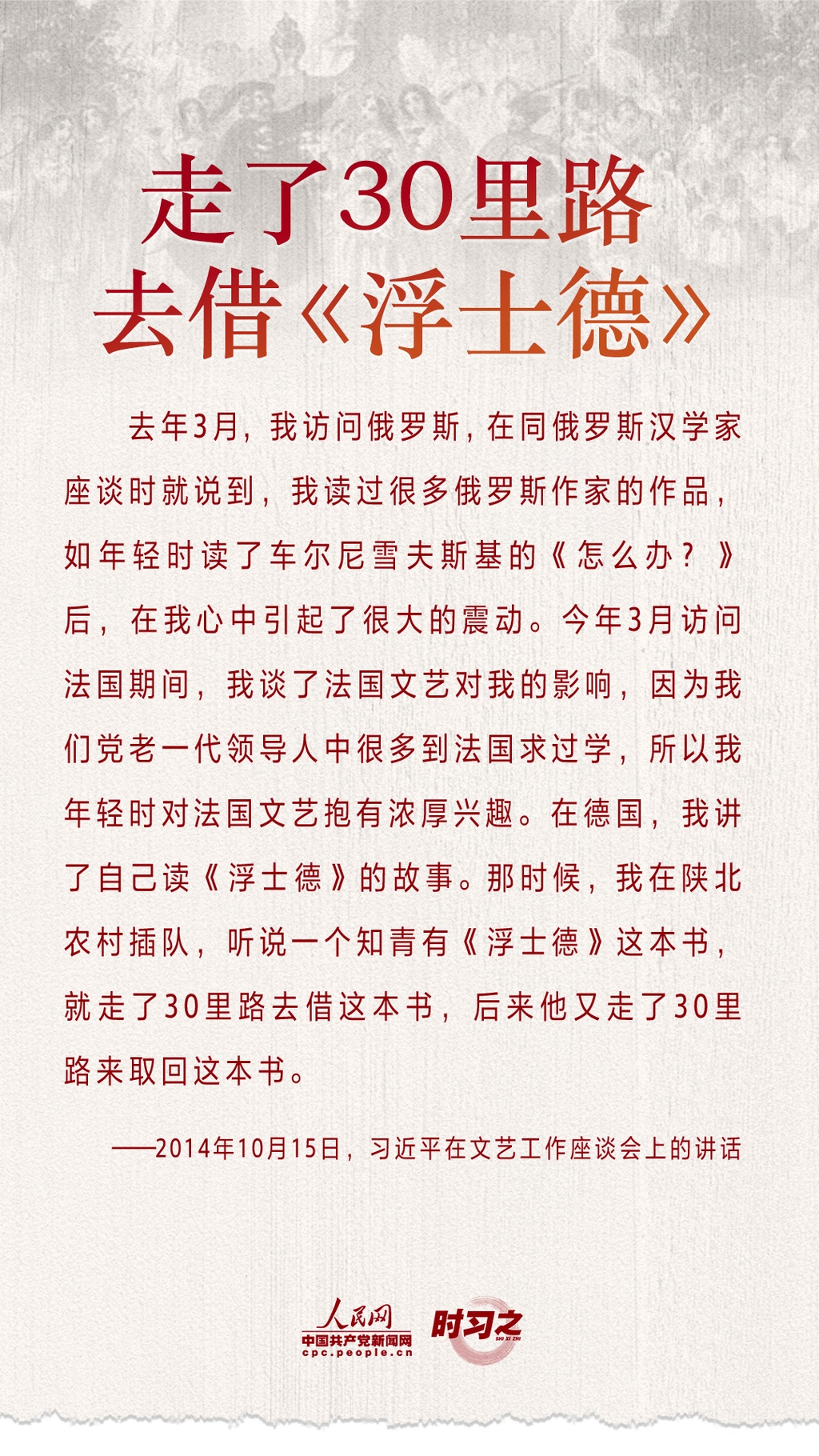 2014年10月15日,习近平总书记主持召开文艺工作座谈会并发表重要讲话。在讲话中,习近平多次回忆起自己青年时期的阅读史,谈及多部国内外经典文学艺术作品。习近平在很多场合都曾表达自己对于文学艺术的喜爱,分享感悟。人民网·中国共产党新闻网梳理了部分习近平讲述过的他熟读文学经典、欣赏文艺作品的故事,以飨读者。