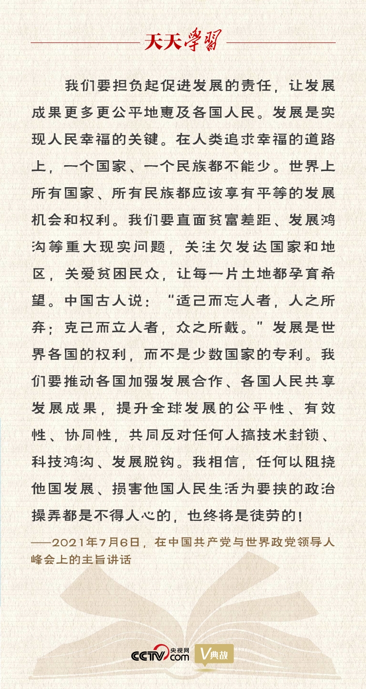 习近平总书记指出,我们要担负起促进发展的责任,让发展成果更多更公平地惠及各国人民。在人类追求幸福的道路上,一个国家、一个民族都不能少。我们要直面贫富差距、发展鸿沟等重大现实问题,关注欠发达国家和地区,关爱贫困民众,让每一片土地都孕育希望。