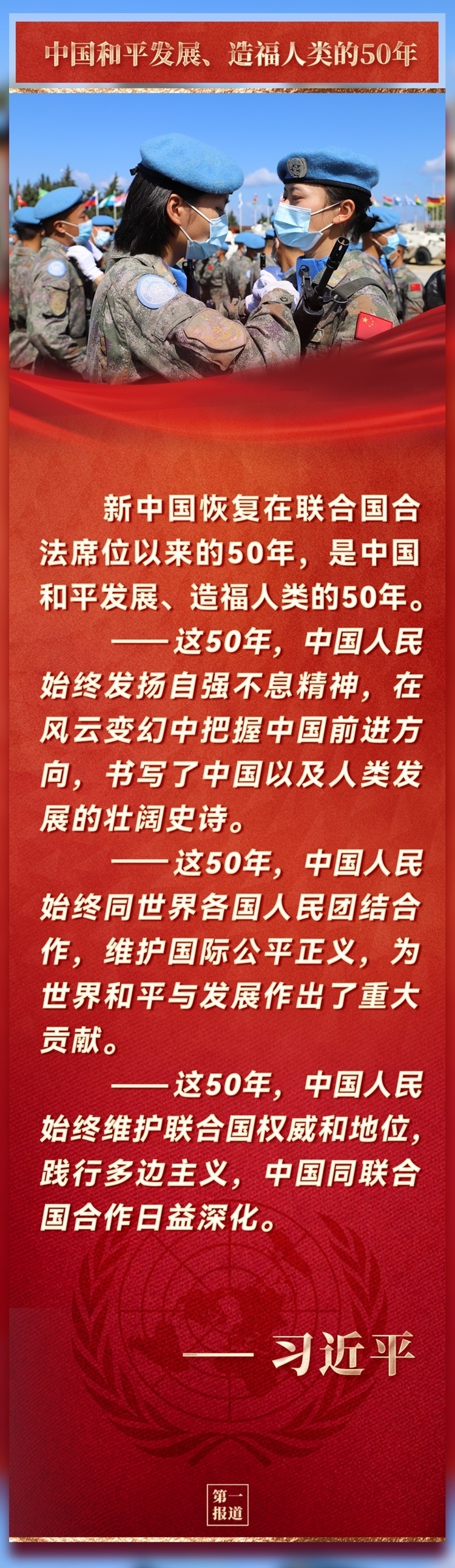 新中国恢复在联合国合法席位以来的50年,是中国和平发展、造福人类的50年。