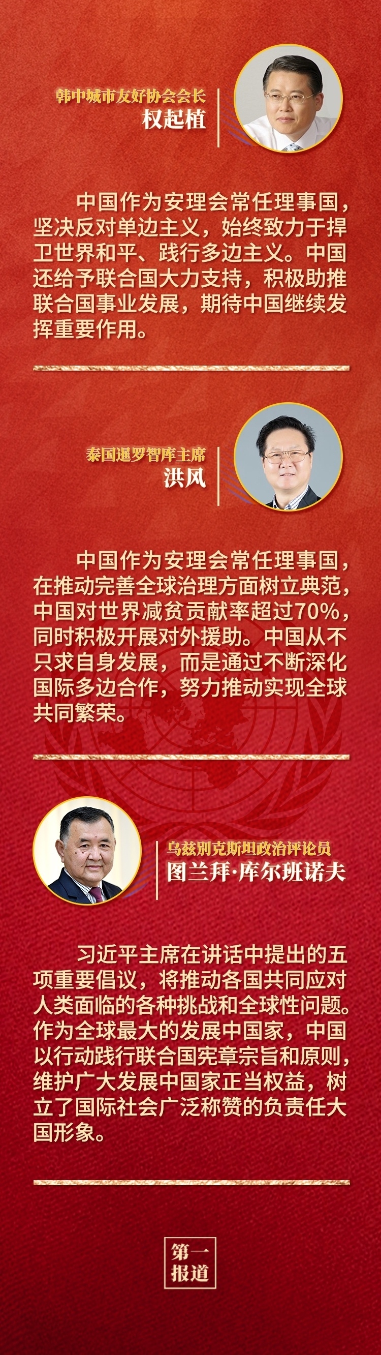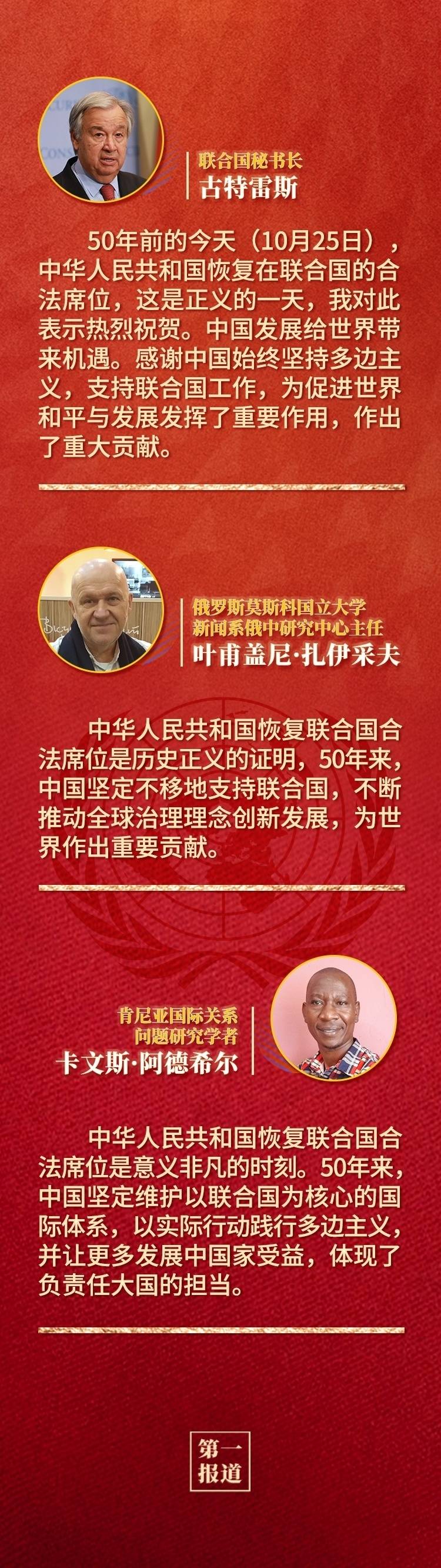 多国人士认为,中华人民共和国恢复联合国合法席位是世界和联合国历史上的一个大事件,习近平主席的重要讲话回顾了中国和平发展、造福人类的50年,为实现世界永续和平发展提出重要倡议,为全球共同推动构建人类命运共同体注入新的强大动力。