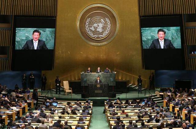 2015年9月28日,国家主席习近平在纽约联合国总部出席第70届联合国大会一般性辩论并发表题为《携手构建合作共赢新伙伴 同心打造人类命运共同体》的重要讲话。 新华社记者 庞兴雷 摄
