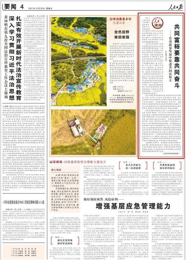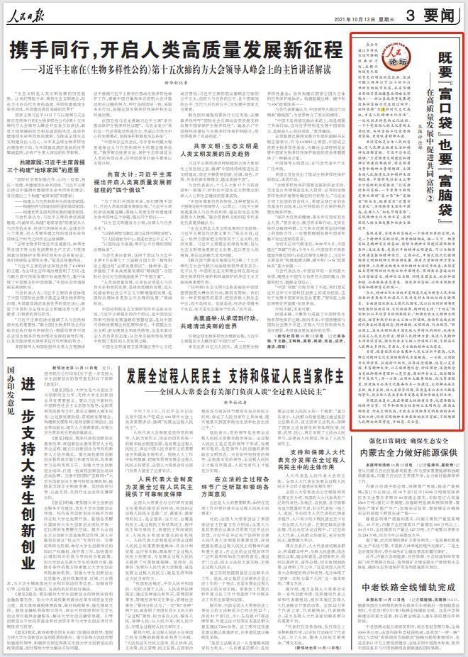扎实推进共同富裕,一个重要方面就是要处理好 " 富口袋 " 和 " 富脑袋 " 的关系,既要家家 " 仓廪实衣食足 ",实现物质生活水平提高,也要人人 " 知礼节明荣辱 ",实现精神文化生活丰富,最终促进人的全面发展和社会全面进步。