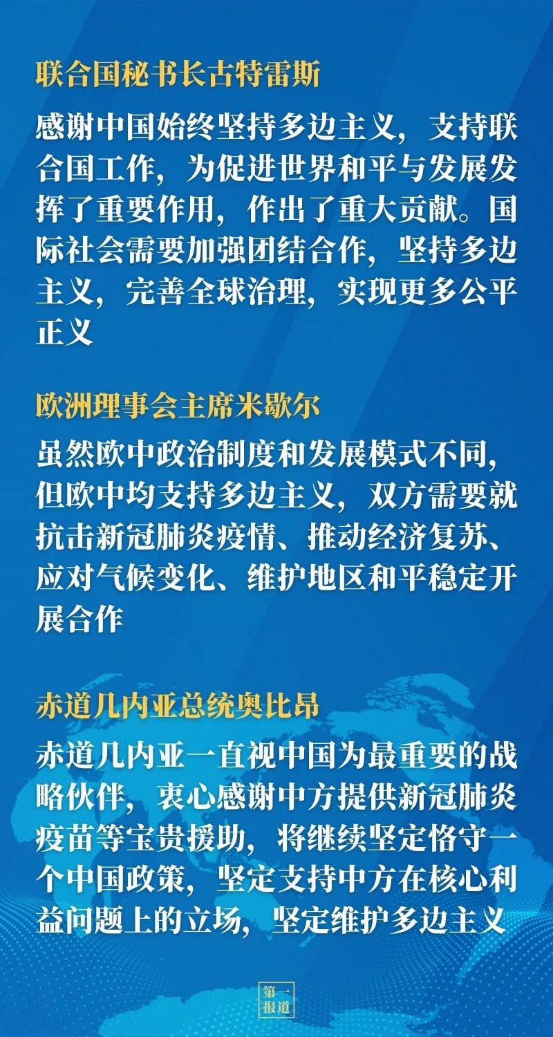 在同联合国秘书长古特雷斯、欧洲理事会主席米歇尔、巴基斯坦总理伊姆兰·汗、巴布亚新几内亚总理马拉佩、赤道几内亚总统奥比昂等国际和地区组织以及国家领导人的交流中,习近平主席都分别同各方就坚持真正的多边主义深入交流,获得积极反馈——