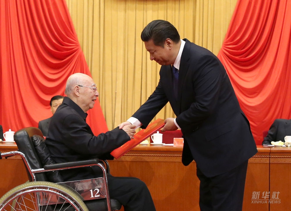 2014年度国家科学技术奖励大会上,习近平总书记弯下腰向坐在轮椅上的中国科学院院士于敏颁发2014年度国家最高科学技术奖。