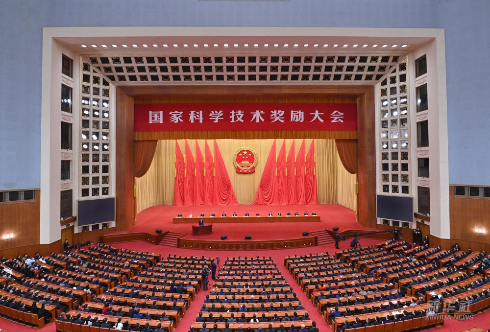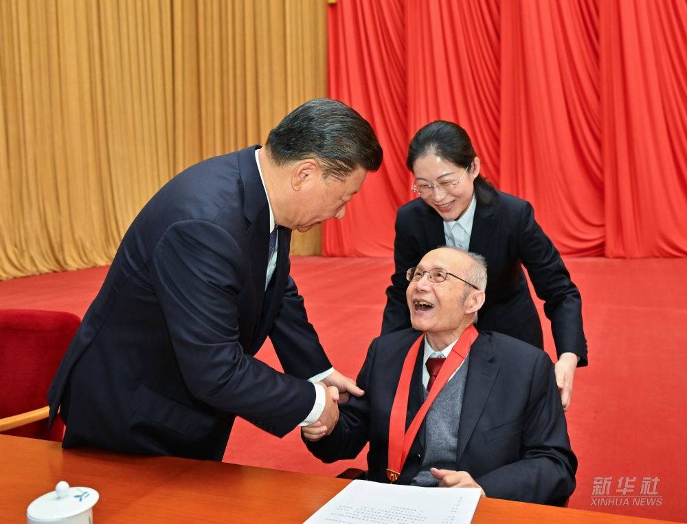 在热烈的掌声中,习近平向获得2020年度国家最高科学技术奖的顾诵芬院士和王大中院士颁发奖章、证书,同他们热情握手表示祝贺,并请他们到主席台就座。