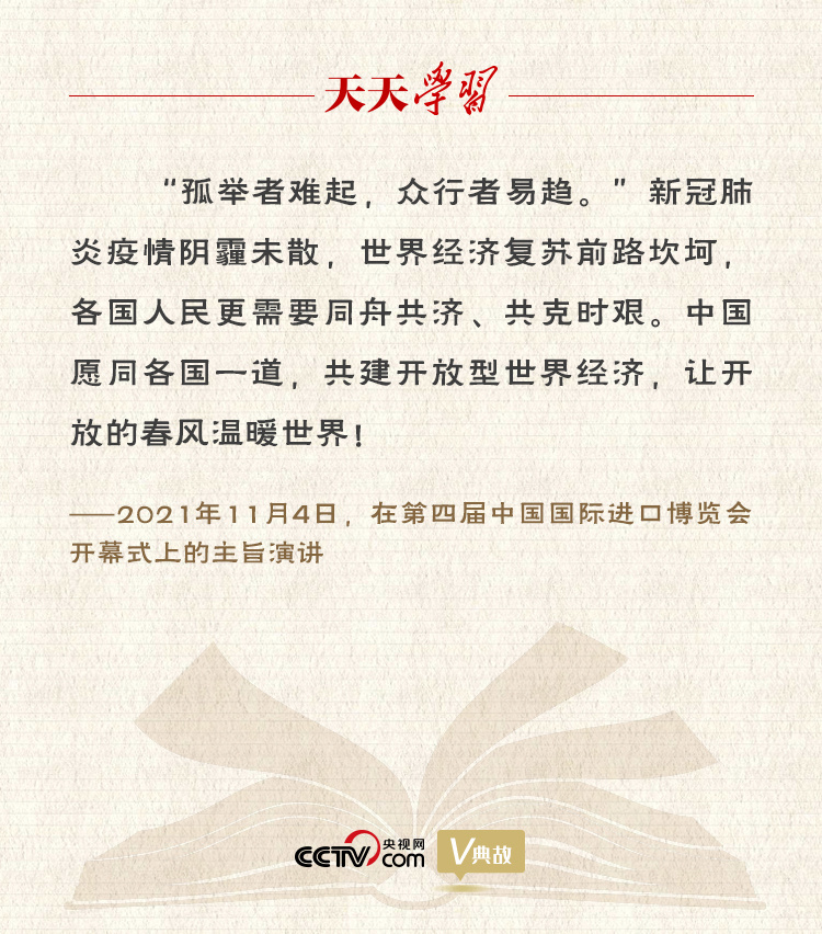 11月4日晚,习近平主席以视频方式出席第四届中国国际进口博览会开幕式并发表题为《让开放的春风温暖世界》的主旨演讲。习主席强调,中国将坚定不移维护真正的多边主义,坚定不移同世界共享市场机遇,坚定不移推动高水平开放,坚定不移维护世界共同利益。在演讲结尾,他用中国古语“孤举者难起,众行者易趋”,向世界发出中国声音、提出中国方案。