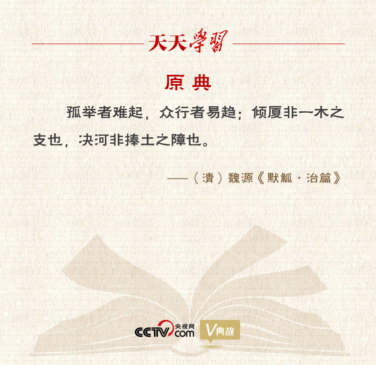 “孤举者难起,众行者易趋”,出自清代启蒙思想家魏源的《默觚·治篇》。《默觚》分《学篇》《治篇》两部分,集中反映了魏源的哲学思想。“默”取自魏源的字“默深”,“觚”为古代用来书写的木简。