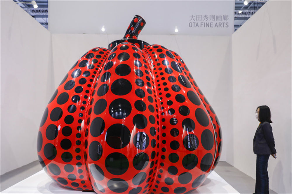 11月5日,观众在第四届进博会服务贸易展区内参观日本艺术家草间弥生的作品《南瓜》。新华社记者 张玉薇 摄