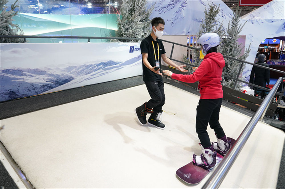 11月5日,参观者在第四届进博会消费品展区的一家展台体验滑雪。新华社记者 丁汀 摄