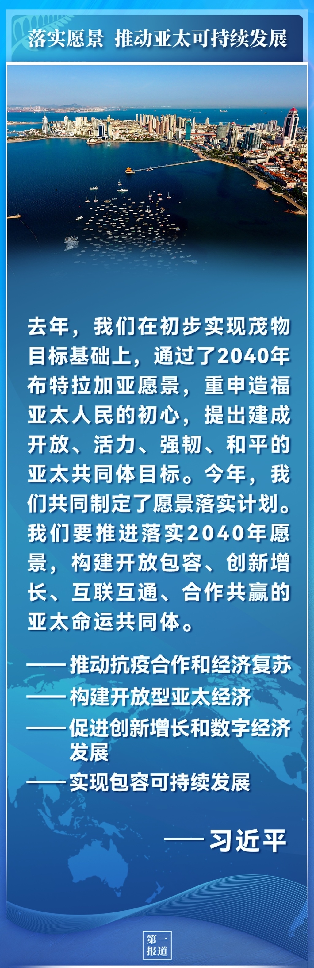 第一,推动抗疫合作和经济复苏。当前,新冠肺炎疫情形势依然严峻,世界经济在脆弱中艰难复苏。早日战胜疫情、恢复经济增长,是当前亚太各成员最重要的任务。要科学应对疫情,深化国际合作,促进疫苗研发、生产、公平分配,确保疫苗在发展中国家的可及性和可负担性,弥合“免疫鸿沟”。中国宣布全年将努力对外提供20亿剂疫苗,迄今已提供超过17亿剂,包括向110多个国家提供无偿捐赠。不久前,我在二十国集团领导人第十六次峰会上代表中国提出了全球疫苗合作行动倡议。中国已明确未来3年内提供30亿美元,用于支持发展中国家抗疫和恢复经济社会发展。中国欢迎亚太经合组织促进关键物资流通和人员安全往来倡议,将继续向“应对疫情和经济复苏”子基金提供支持,助力各成员恢复和发展经济。