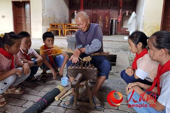 在于都县段屋乡寒信村祠堂里,今年77岁的肖南斗坐在草鞋凳上,一个弧形的腰杆、四根麻绳、一撮稻草,边打草鞋边给家乡的孩子们讲述草鞋与长征的故事。