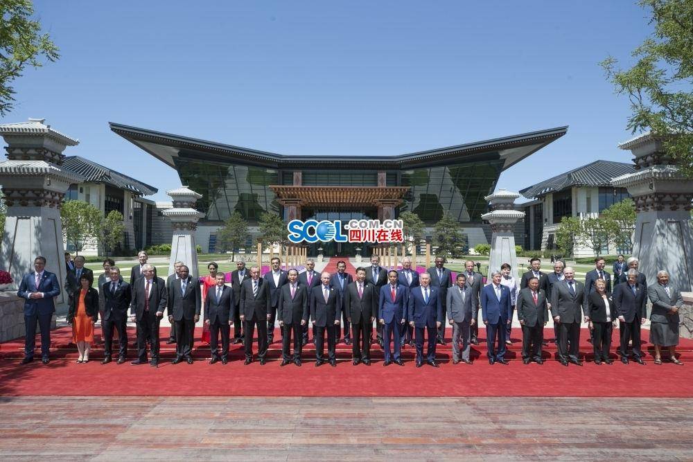 ↑2017年5月15日,“一带一路”国际合作高峰论坛在北京雁栖湖国际会议中心举行圆桌峰会,习近平主持会议并致辞。这是当天中午,习近平同与会领导人和国际组织负责人以国际会议中心“汉唐飞扬”主建筑为背景集体合影。