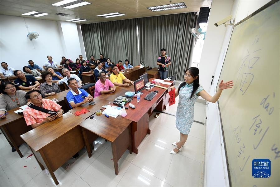 在广西大学,老师给泰国访华团成员讲解汉字“福”(2018年6月25日摄)。新华社记者 陆波岸 摄