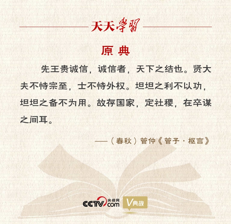 “诚信者,天下之结也”出自《管子·枢言》。结:关键。意思是恪守诚信,是天下行为准则的关键。