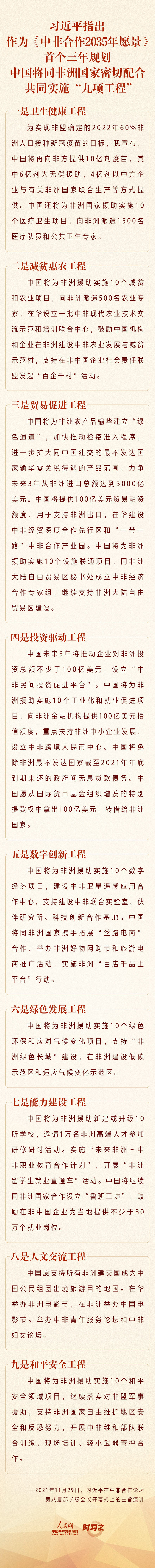 11月29日晚,国家主席习近平在北京以视频方式出席中非合作论坛第八届部长级会议开幕式并发表主旨演讲。习近平就构建新时代中非命运共同体提出4点主张,并指出,作为《中非合作2035年愿景》首个三年规划,中国将同非洲国家密切配合,共同实施“九项工程”。