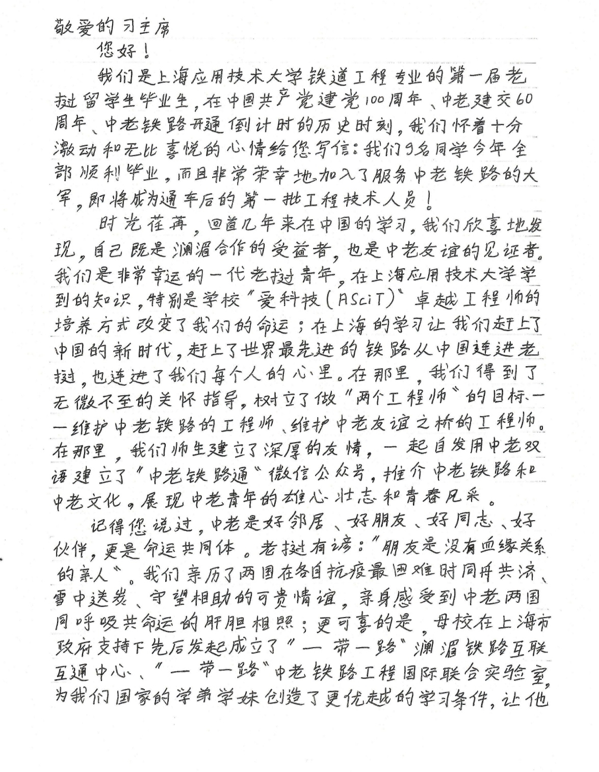 这封来信是上海应用技术大学铁道工程专业的第一届老挝留学生联合书写的。9名同学今年全部顺利毕业,成为中老铁路通车后的第一批工程技术人员。