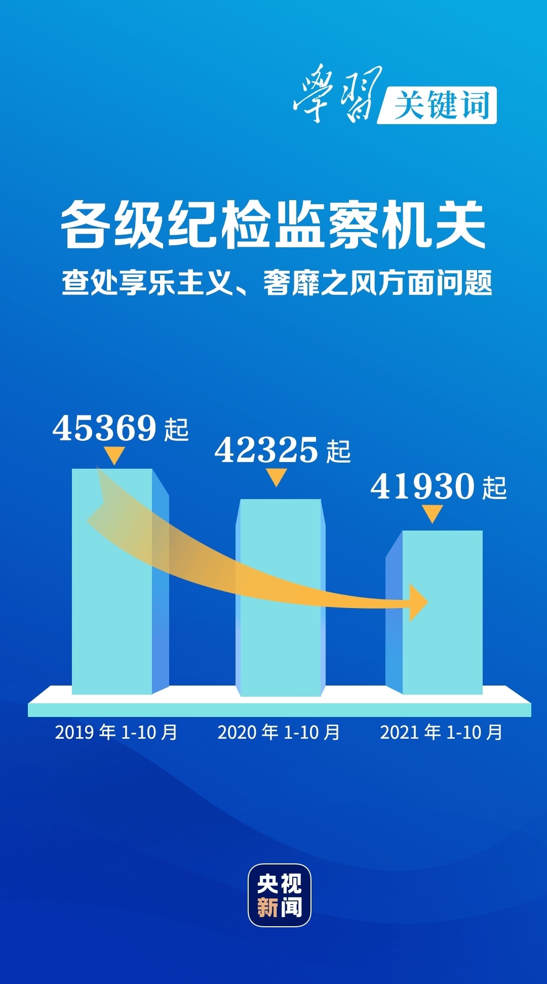 值得一提的是,今年前10个月,各级纪检监察机关查处享乐主义、奢靡之风方面问题共41930起 ,相比前两年同期的问题查处数量,呈下降趋势。