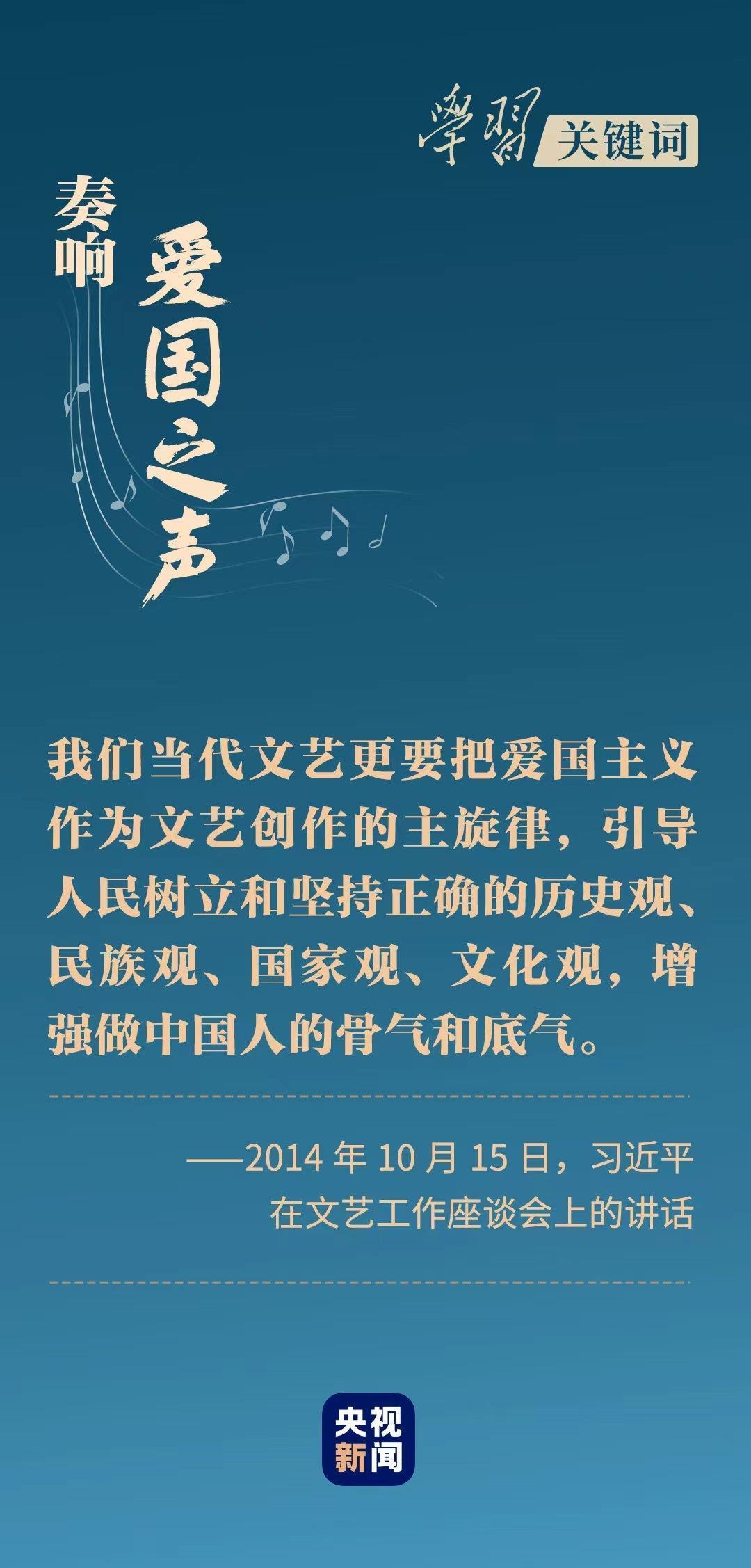 “我们要高扬爱国主义主旋律,用生动的文学语言和光彩夺目的艺术形象,装点祖国的秀美河山,描绘中华民族的卓越风华,激发每一个中国人的民族自豪感和国家荣誉感。”