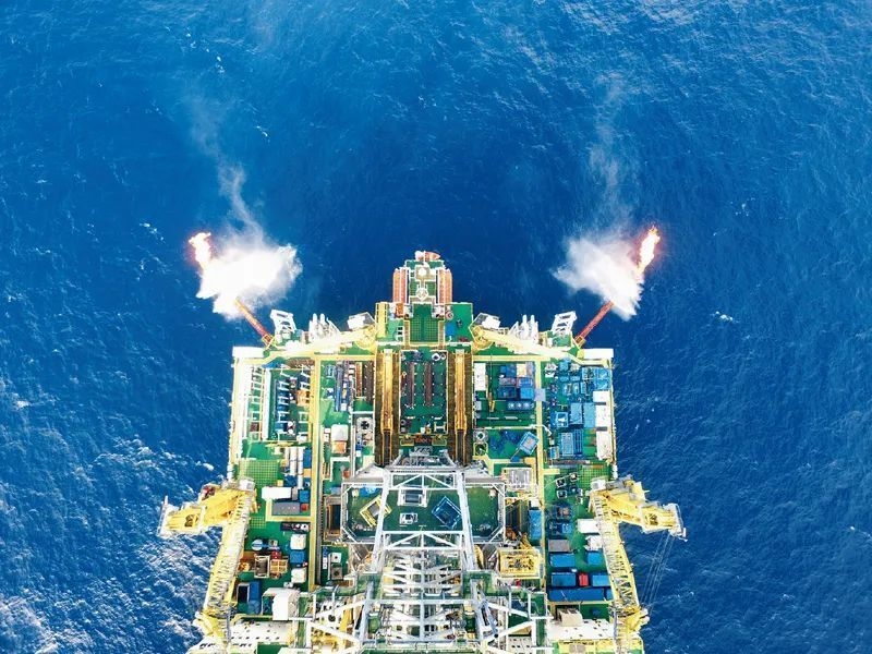 我国加快发展新能源和可再生能源,能源消费结构不断优化。2020年,我国率先实现水平井钻采深海“可燃冰”。图为我国海域天然气水合物第二轮试采平台“蓝鲸2号”喷出双火焰(2020年3月25日摄)。新华社发 广州海洋地质调查局供图