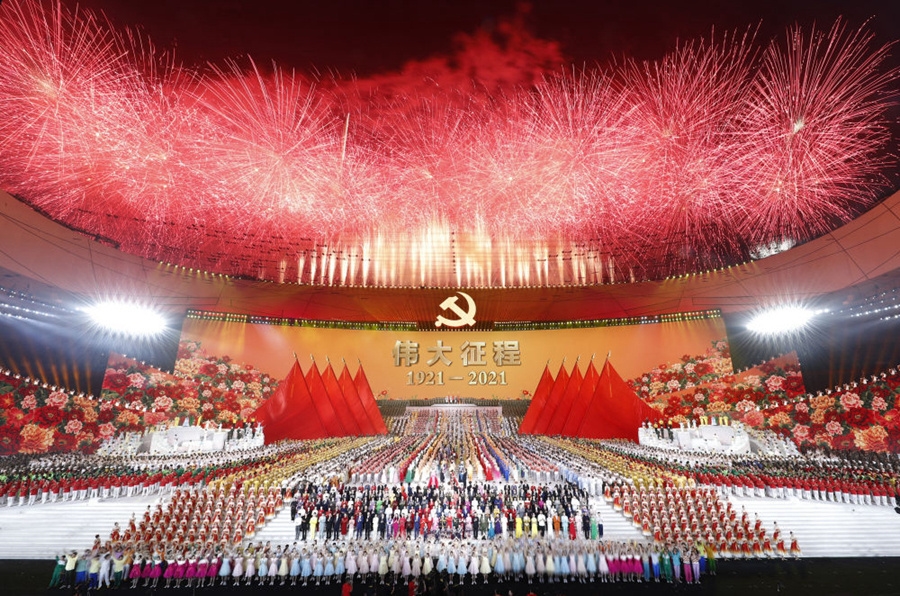 2021年6月28日晚,庆祝中国共产党成立100周年文艺演出《伟大征程》在国家体育场盛大举行。新华社记者 黄敬文 摄