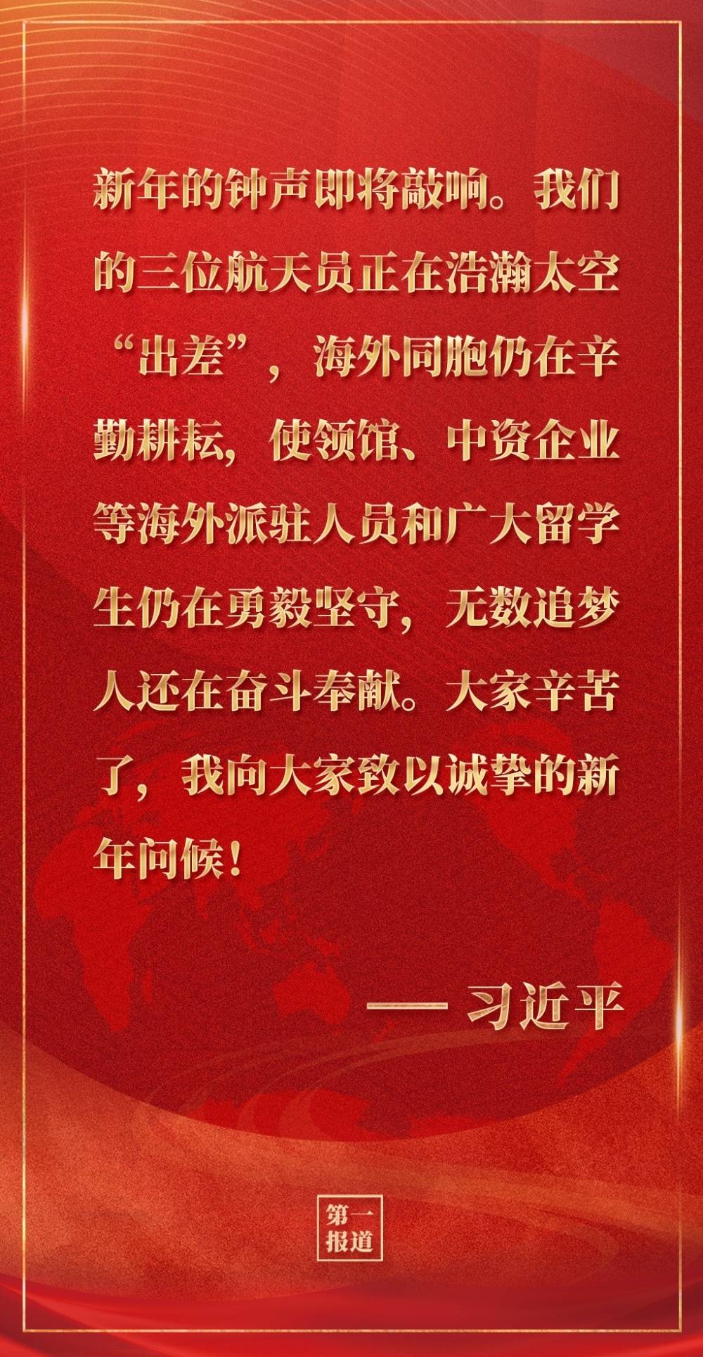 新年的钟声即将敲响。我们的三位航天员正在浩瀚太空“出差”,海外同胞仍在辛勤耕耘,使领馆、中资企业等海外派驻人员和广大留学生仍在勇毅坚守,无数追梦人还在奋斗奉献。大家辛苦了,我向大家致以诚挚的新年问候!