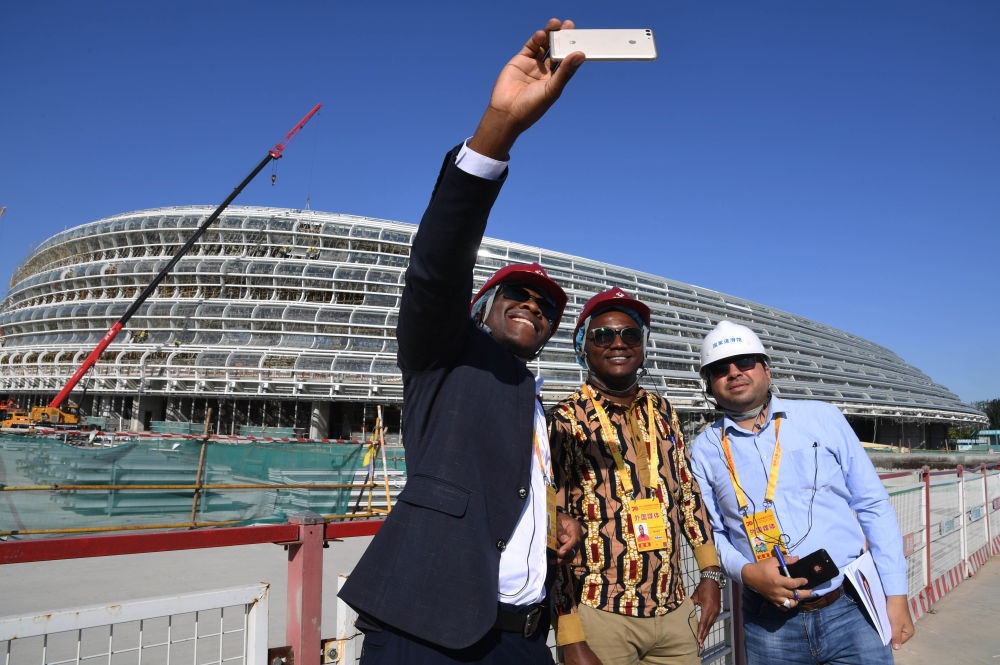 ↑2019年9月24日,境外媒体记者在国家速滑馆“冰丝带”前拍照留念。当日,来自境外82家媒体的103名记者走进国家速滑馆“冰丝带”、国家游泳中心“水立方”和国家体育场“鸟巢”,了解北京2022年冬奥会场馆建设情况。