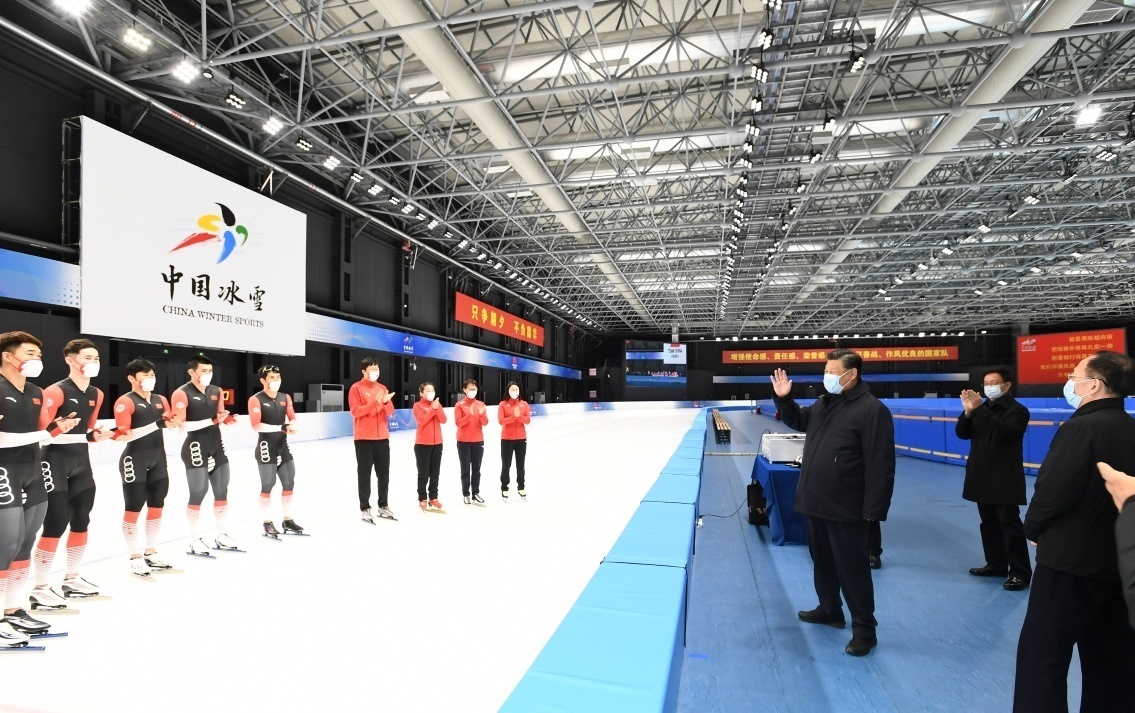 1月4日,中共中央总书记、国家主席、中央军委主席习近平在北京考察2022年冬奥会、冬残奥会筹办备赛工作。这是4日下午,习近平在二七厂冰雪项目训练基地速滑馆,向参训运动员、教练员表示慰问。