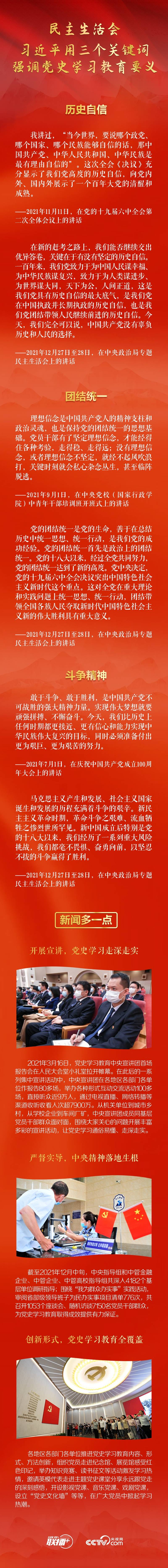 2021年底,中央政治局召开党史学习教育专题民主生活会,总书记用历史自信、团结统一、斗争精神三个关键词强调党史学习教育要义:全党要学史明理、学史增信、学史崇德、学史力行,就是为了增加历史自信、增进团结统一、增强斗争精神。