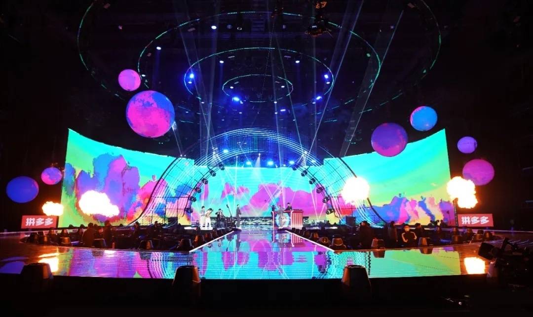 在舞美设计上,2022网络春晚大胆“开新”,将设计理念延伸至具有无限想象空间的宇宙苍穹,打造具有网络春晚独特气质的星际“开新”乐园。舞美以丝带星轨为主体,巨幅环形屏幕配合多个大小不一的球体,形成丰富的层次感和唯美浪漫的视觉体验。