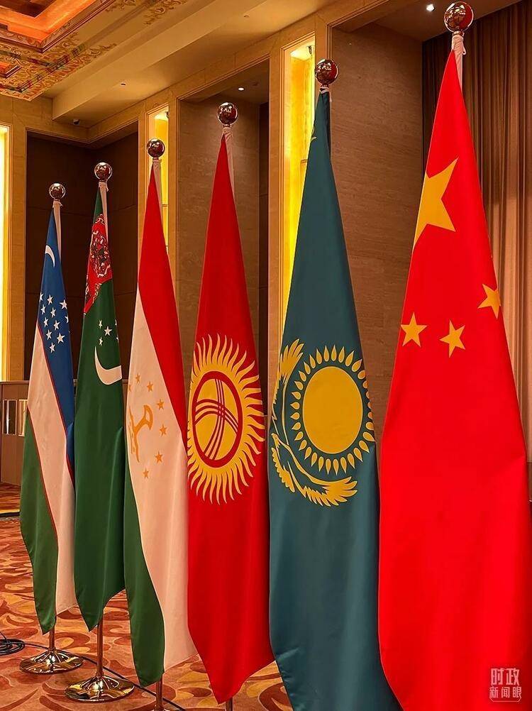 △会场摆放的中国与中亚五国国旗。(总台央视记者赵化拍摄)