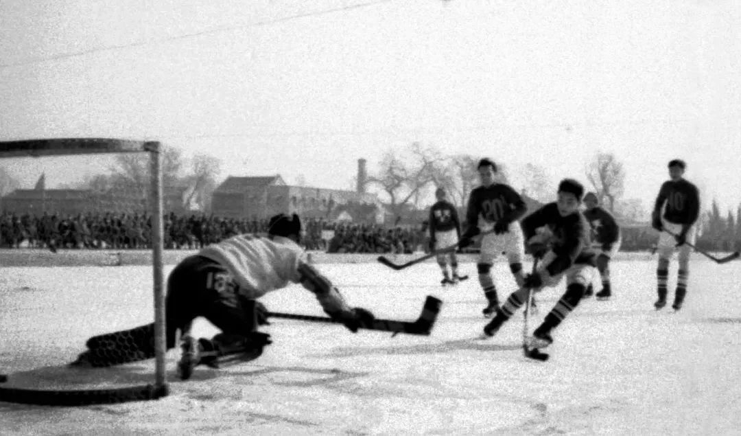 1953年,华北区冰上运动会,北京队与天津队的冰球比赛。(图源:人民画报)