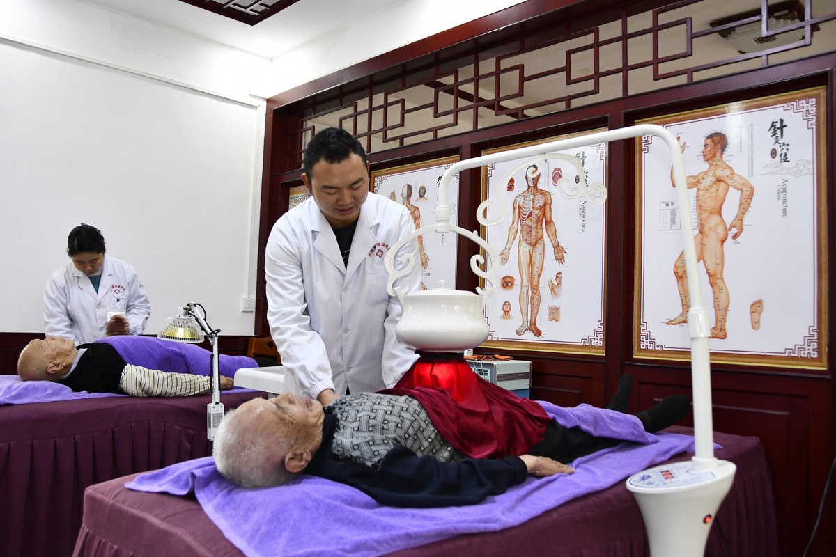 △江西省兴国县田庄上养老中心的医护人员为老人进行中医理疗。