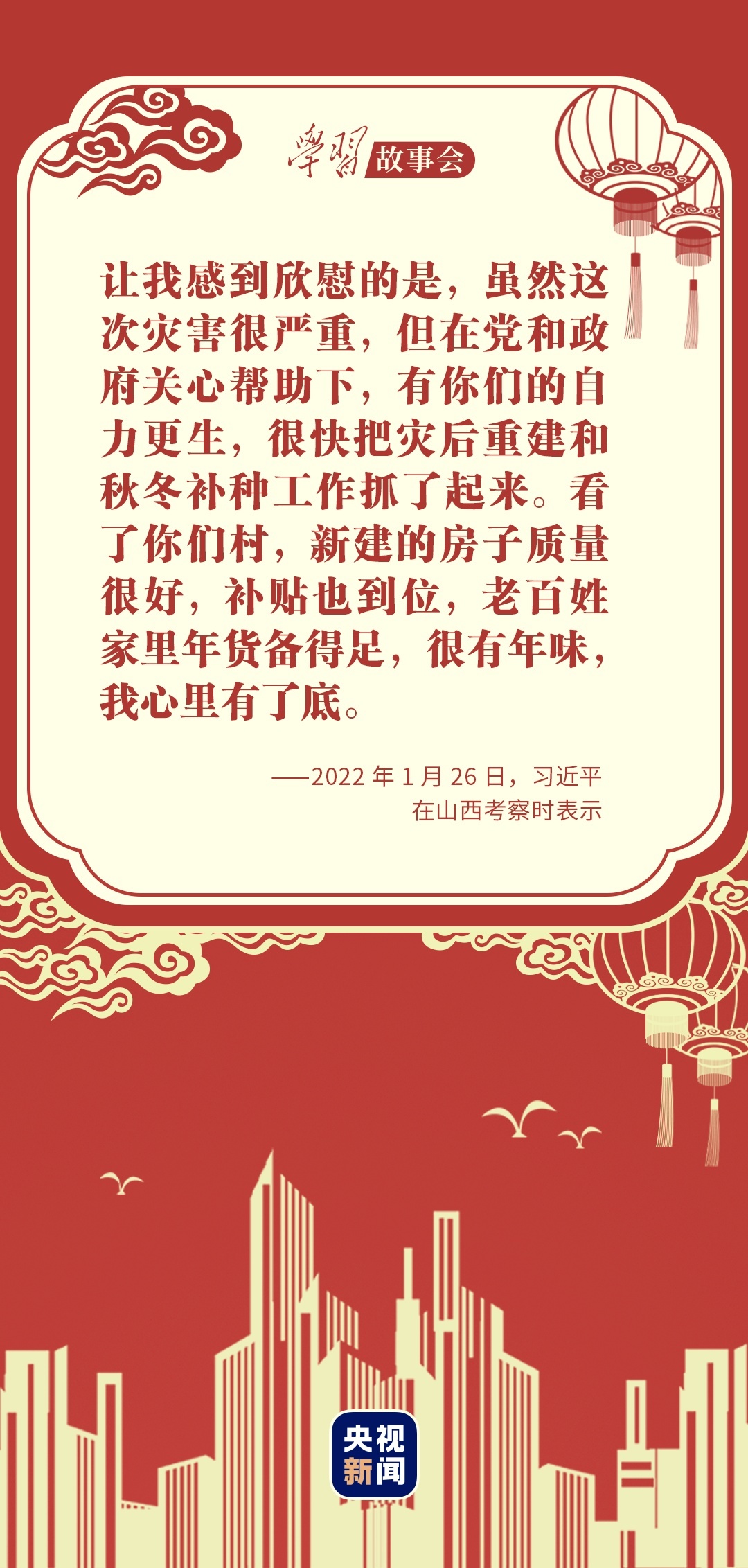 1月26日,习近平总书记冒雪来到山西省临汾市,为乡亲们送去党中央的关心和慰问,向全国各族人民致以美好的新春祝福。