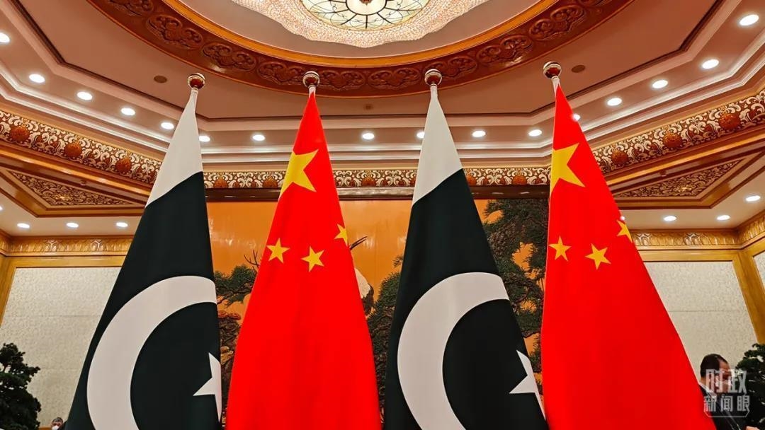 △会谈现场摆放的巴基斯坦国旗和五星红旗。(总台央视记者杨立峰拍摄)