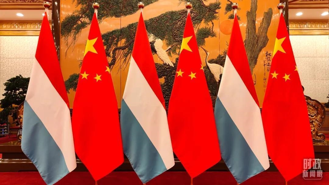 △会谈现场摆放的卢森堡国旗和五星红旗。(总台央视记者杨立峰拍摄)