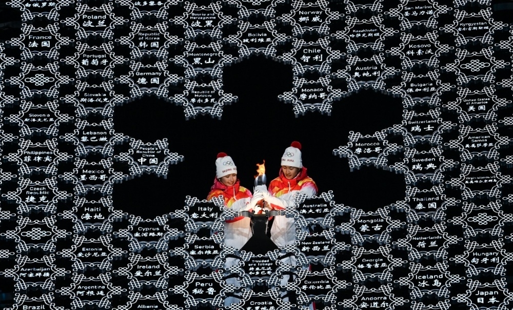 ↑这是最后一棒火炬手迪妮格尔·衣拉木江(左)和赵嘉文将火炬嵌入“大雪花”中央。新华社记者李尕摄