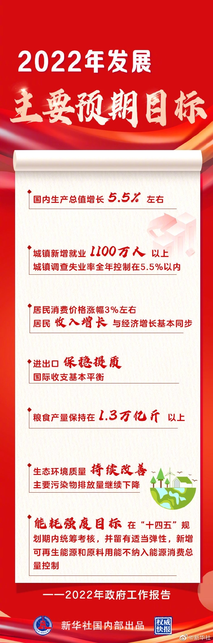 【权威快报|#国内生产总值预期增长5.5%左右#】5日提请十三届全国人大五次会议审议的政府工作报告提出,#今年发展主要预期目标#是:国内生产总值增长5.5%左右;城镇新增就业1100万人以上,城镇调查失业率全年控制在5.5%以内;居民消费价格涨幅3%左右;居民收入增长与经济增长基本同步;进出口保稳提质,国际收支基本平衡;粮食产量保持在1.3万亿斤以上;生态环境质量持续改善,主要污染物排放量继续下降;能耗强度目标在“十四五”规划期内统筹考核,并留有适当弹性,新增可再生能源和原料用能不纳入能源消费总量控制。#全国两会2022#