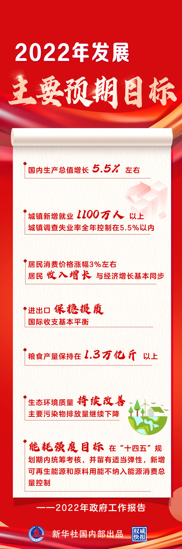 3月5日提请十三届全国人大五次会议审议的政府工作报告提出,今年发展主要预期目标是:国内生产总值增长5.5%左右;城镇新增就业1100万人以上,城镇调查失业率全年控制在5.5%以内;居民消费价格涨幅3%左右;居民收入增长与经济增长基本同步;进出口保稳提质,国际收支基本平衡;粮食产量保持在1.3万亿斤以上;生态环境质量持续改善,主要污染物排放量继续下降;能耗强度目标在“十四五”规划期内统筹考核,并留有适当弹性,新增可再生能源和原料用能不纳入能源消费总量控制。
