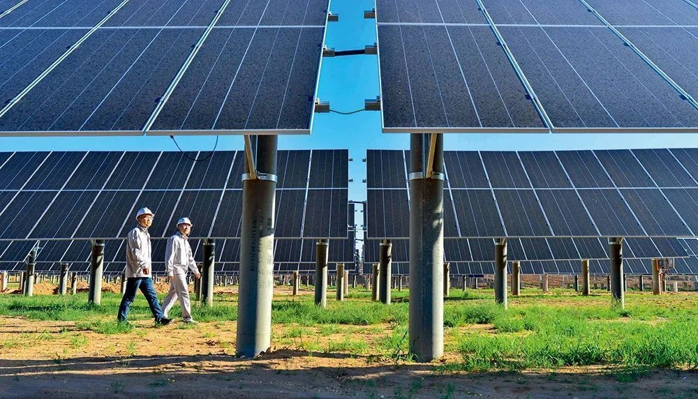 ▲ 2021年7月8日,工作人员在内蒙古伊金霍洛旗天骄绿能50万千瓦采煤沉陷区生态治理光伏发电示范项目区里巡查 王正摄