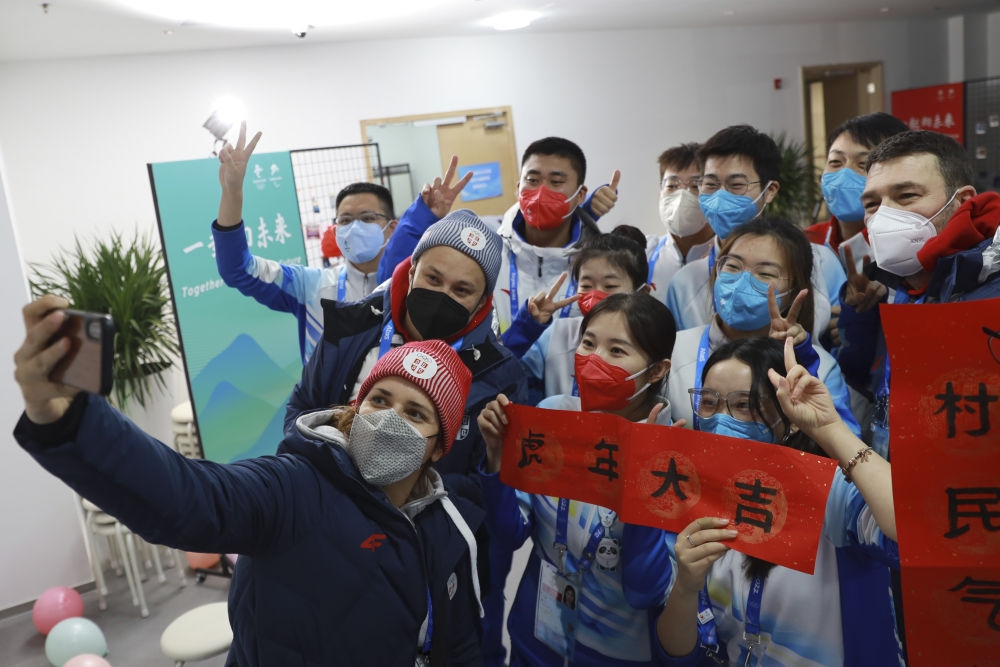 除夕当天,塞尔维亚代表团成员和志愿者在延庆冬奥村合影留念。