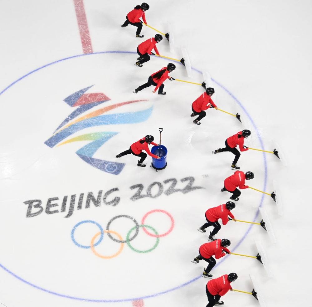 五棵松体育中心工作人员在冰球比赛间隙清理冰面。