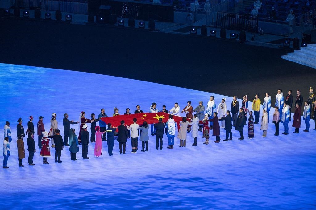 △2月4日,2022北京冬奥会开幕式在国家体育场举行。鸟巢中央,一面五星红旗在12位小朋友手中徐徐展开。随后,他们将国旗传递给176名代表。