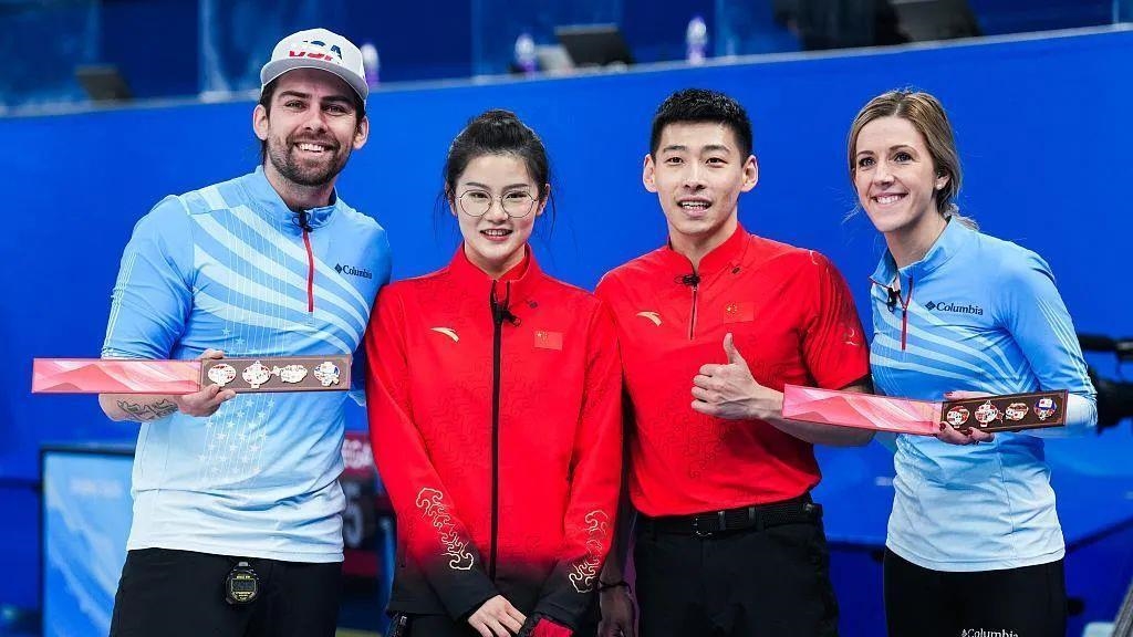 △北京冬奥会冰壶混合双人循环赛后,中国队与美国队合影。