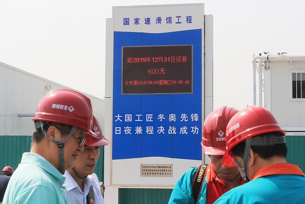 △2018年5月9日,北京,冬奥建设项目国家速滑馆现场倒计时牌启用。