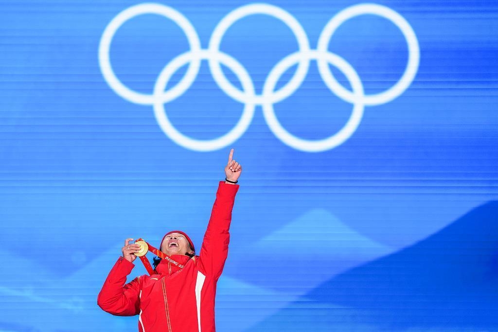 △2月15日,北京冬奥会单板滑雪男子大跳台颁奖仪式,苏翊鸣兴奋站上领奖台。