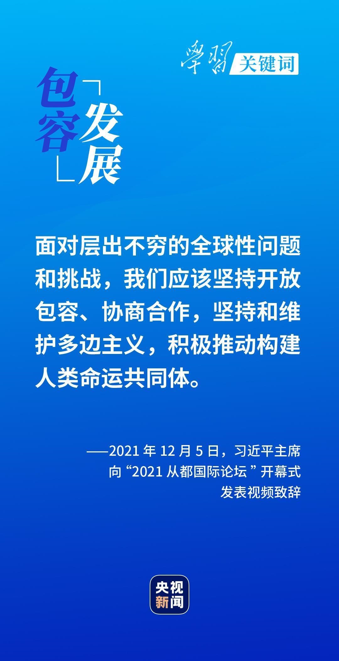 “世界各国人民一道努力,回应时代呼唤,加强全球治理,以创新引领发展,朝着构建人类命运共同体的方向不断迈进。”