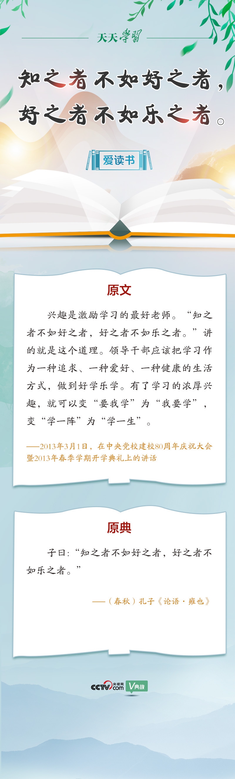 在第27个世界读书日到来之际,央视网《天天学习》与您一起重温习近平总书记爱读书、勤读书、读好书、善读书、擅用书所引述用典,学习领会习近平总书记的读书观,积极参加全民阅读活动,为中华民族的伟大复兴而努力读书,让智慧之光照亮我们每个人前行之路!