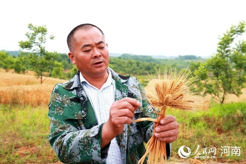 杨长太查看小麦成熟度。人民网记者 慎志远摄